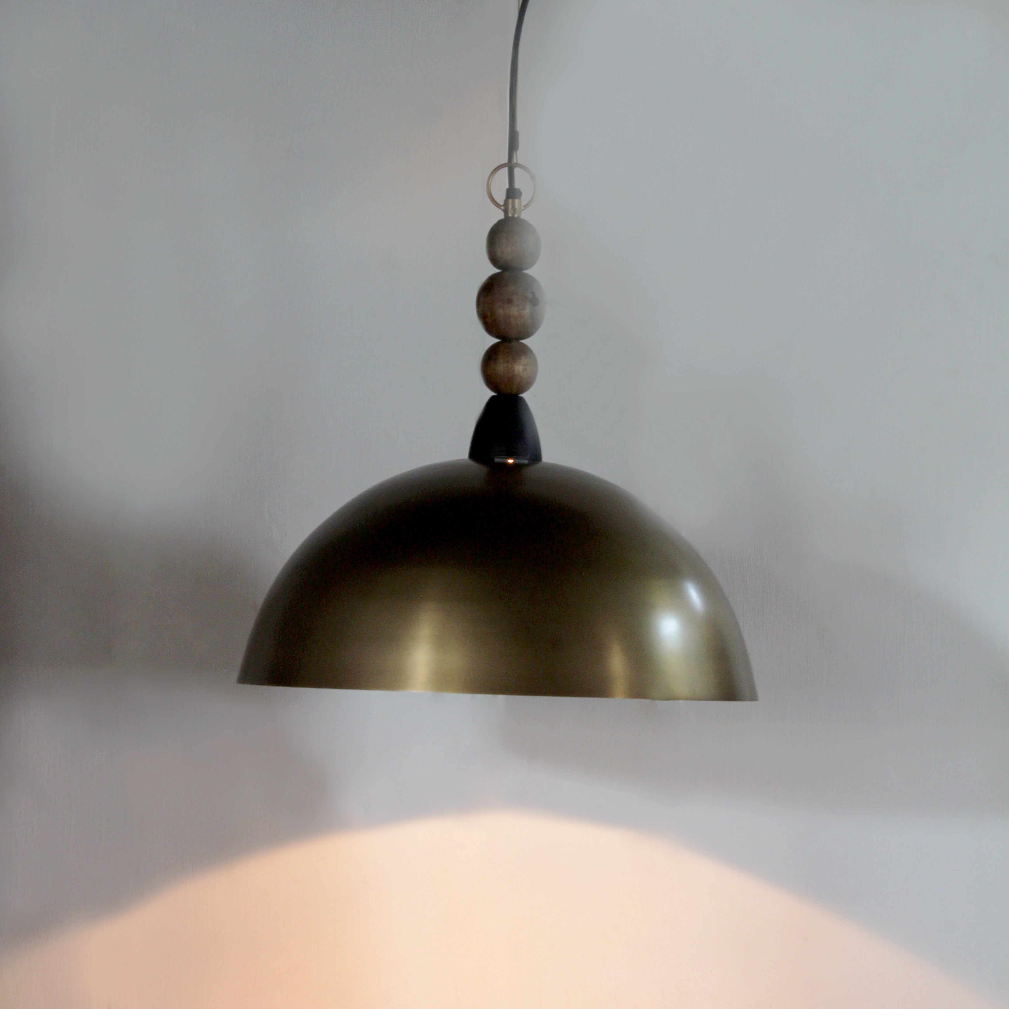 What is a metal round hanging light with a grey finish?